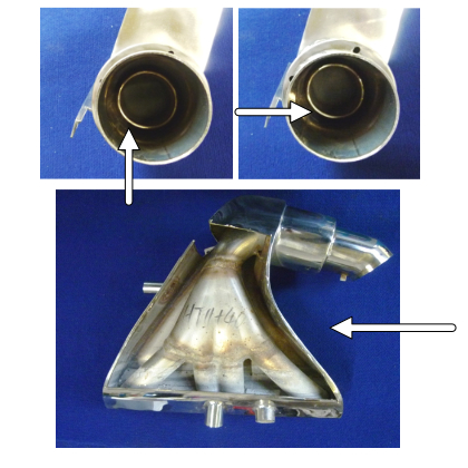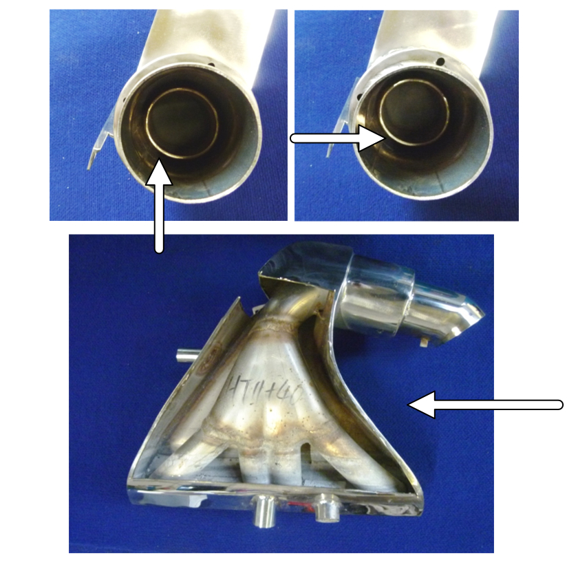 Opposite you will clearly see actual photos of the anti-reversion system as it appears when looking up the 3" secondary expansion exhaust pipe, the cooling water exits from the holes (2x are visible in the top around the outside of the secondary pipe). You will also see a cut away picture of a "cut away" exhaust manifold showing the beautifully flowing collector box joining the 4 individual pipes to the primary pipe leading to the 3" secondary. BUT THIS IS JUST THE FIRST OF MANY ADVANTAGES !.