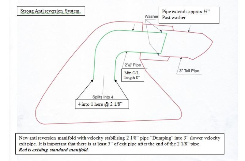 "Swaymar Marine", working closely with "Marine torq" of Australia, have developed what is probably the first dedicated anti-reversion system for marine exhausts. Very few long term boat owners have not experienced water getting back up the exhausts and into the engine and the catastrophic damage that causes. Our anti-reversion system creates a higher velocity gas in the primary pipe so that if "pulsing" should take place in the 3" secondary pipe it is weaker and therefore defeated by the higher velocity gas exiting the smaller primary pipe. See diagram.